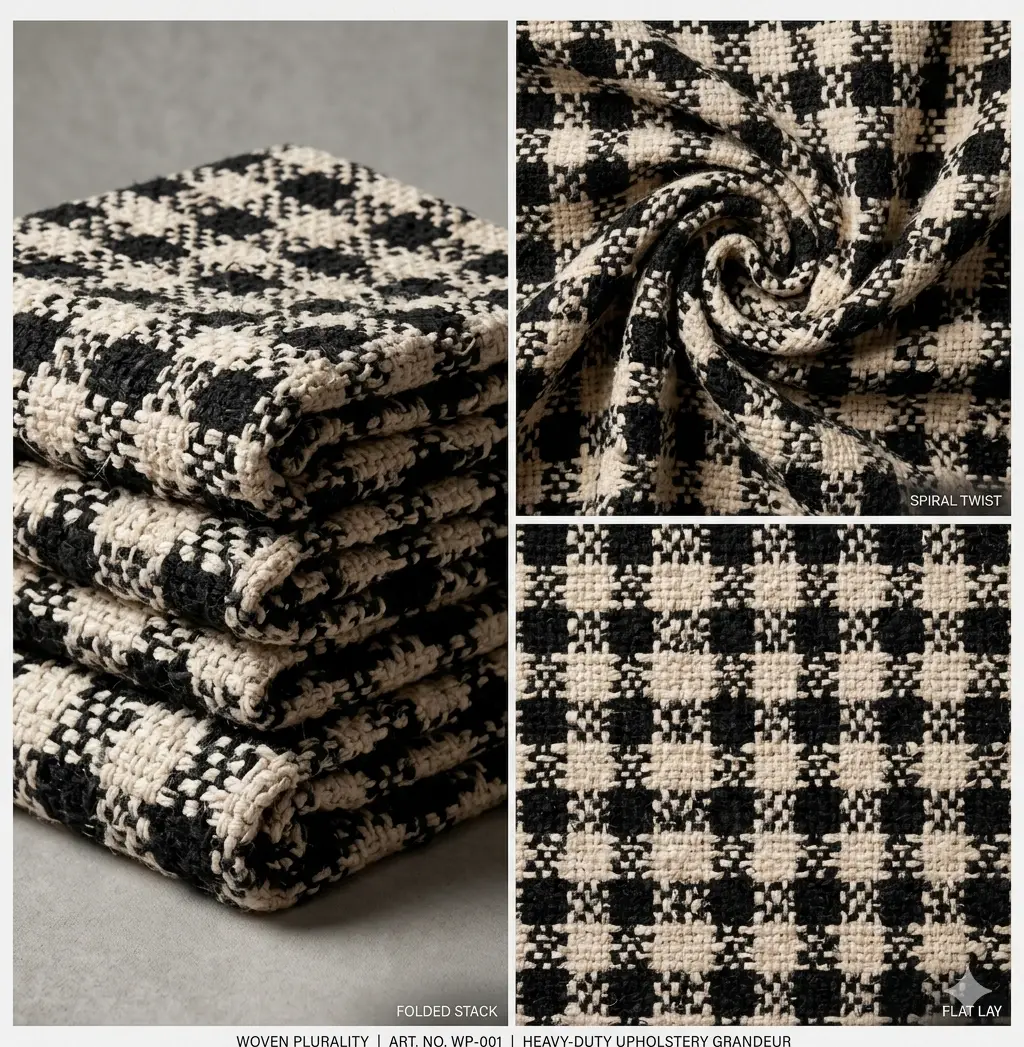 Bold black and ivory check raw silk fabric with a heavy woven texture for modern interiors.