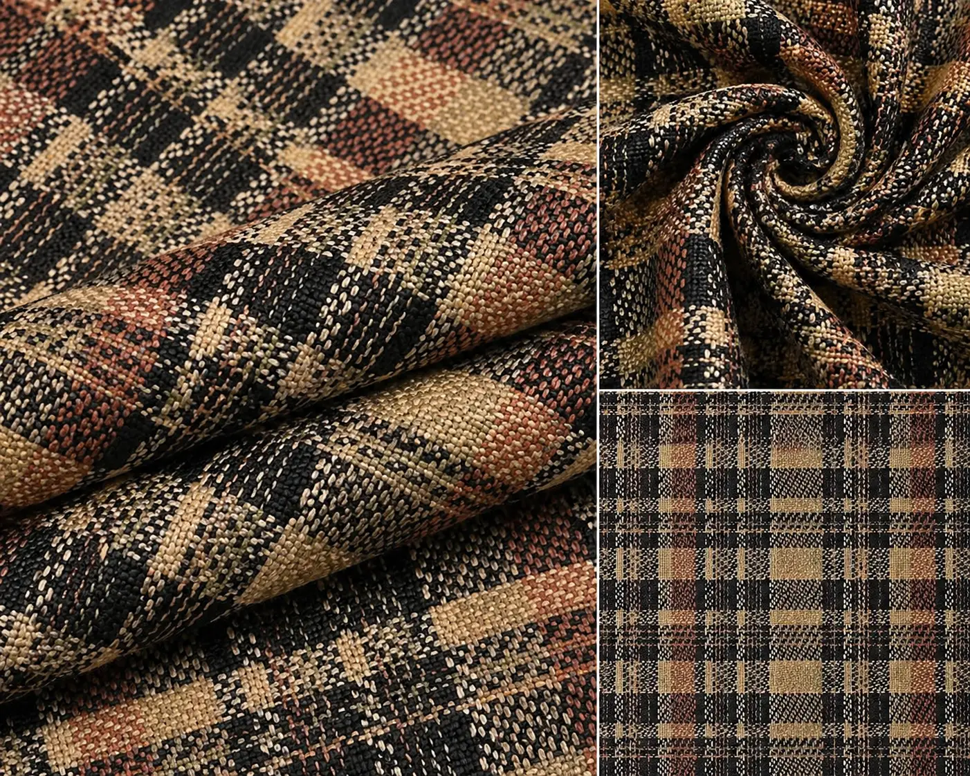 This black, tan, and coral plaid raw silk fabric combines warm neutral tones with bold black contrast and subtle coral accents. Its textured woven pattern is ideal for upholstery, drapery, cushions, and custom interior design projects that need depth and visual interest.