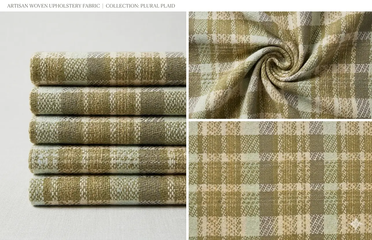 This olive plaid raw silk fabric combines earthy olive, beige, and cream tones in a refined woven check pattern. The fabric is ideal for custom drapery, upholstery, pillows, roman shades, and statement interiors that need natural color and designer texture.