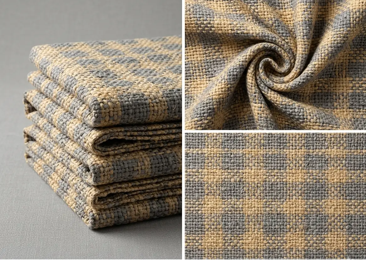 Rustic grey and gold raw silk fabric with a check pattern and heavy woven texture.